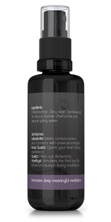 The all-natural essential oils used in the aromatherapy spray, Breathe, are Frankincense, Sandalwood, Ho’wood, Roman Chamomile, and Clary Sage, combined with natural spring water and the gemstones Rose Quartz, Labradorite, Clear Quartz, and Amethyst (read more about the gemstones below), bottled in