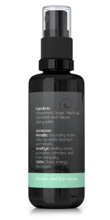 The all natural essential oils used in the, Nausea Relief, aromatherapy spray are Peppermint, Ginger, Patchouli and Spearmint, combined with natural spring water and the gemstones Hematite, Amethyst and Calcite (read more about the gemstones below), this blend provides relief from nausea.