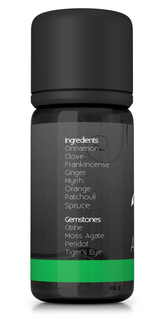 The all-natural essential oils used in the aromatherapy diffuser blend, Abundance, are Cinnamon, Clove, Frankincense, Ginger, Myrrh, Sweet Orange, Patchouli, and Spruce, combined with the gemstones Citrine, Moss Agate, Peridot and Tiger’s Eye (read more about the gemstones below). Bottled in violet glass, which maintains the highest energy vibrations and strongly protects the essential oils. The combination of the properties of the all-natural essential oils and the gemstones makes this a powerful blend infusing