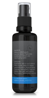 The all natural essential oils used in the aromatherapy spray Calm are Geranium, Helichysum, Lavender, Neroli, Roman Chamomile, Sandalwood, combined with natural spring water and the gemstones, Aquamarine, Green Flourite, Turquoise and Rose Quartz ( read about the gemstones below), bottled in violet glass which maintain the highest energy vibration and strongly protects the essential oils. For relief from stress, agitation and PTSD.